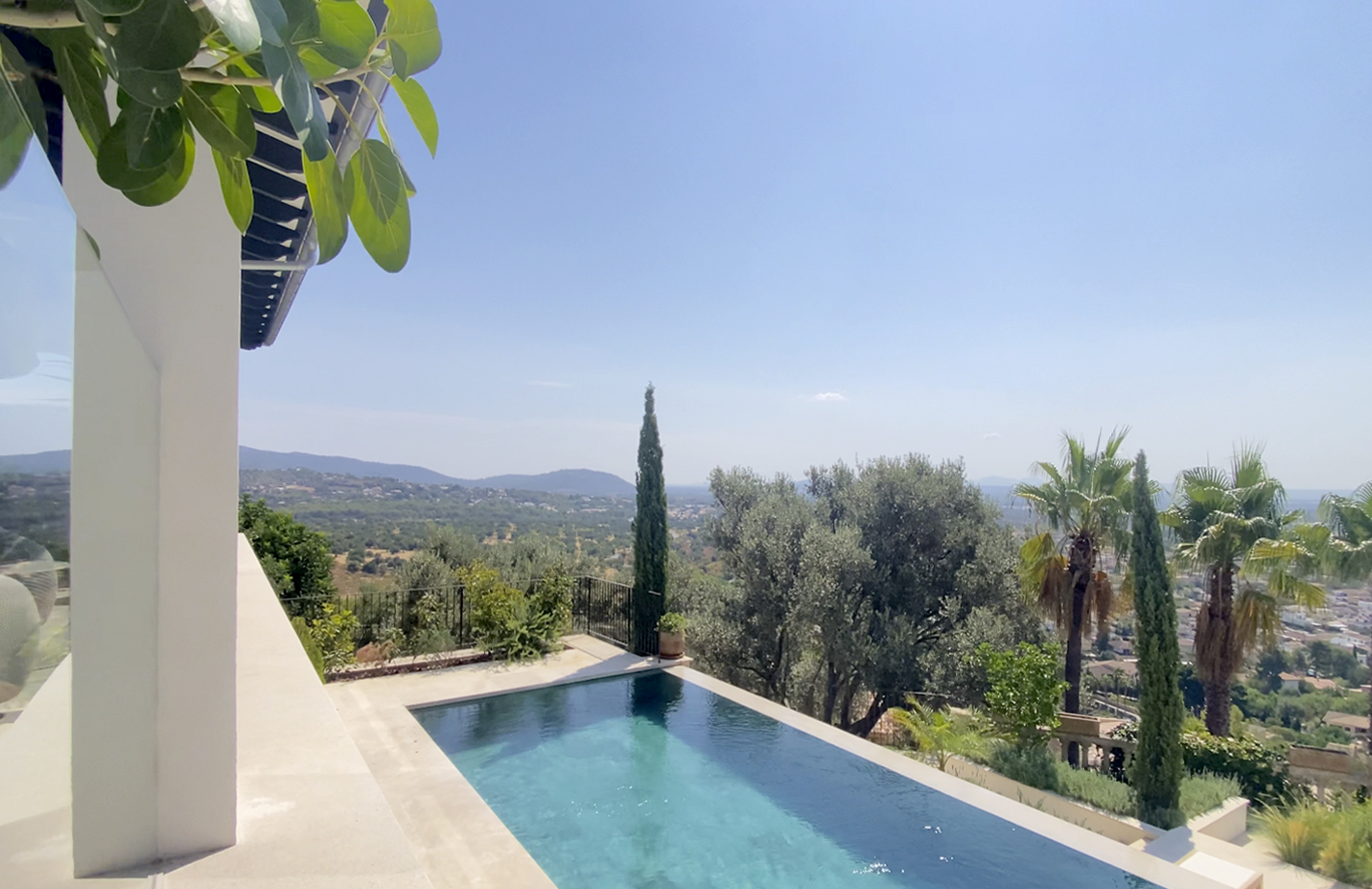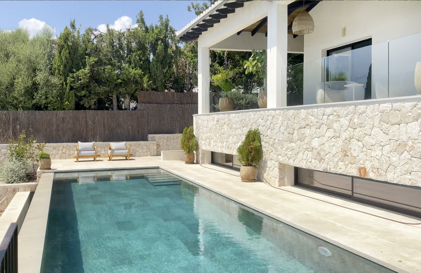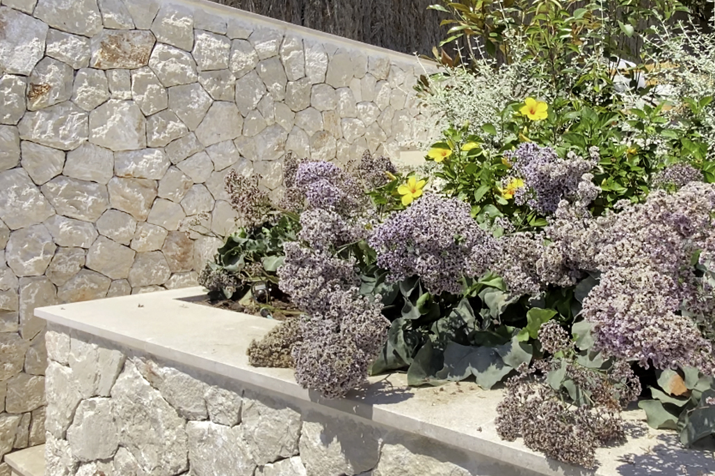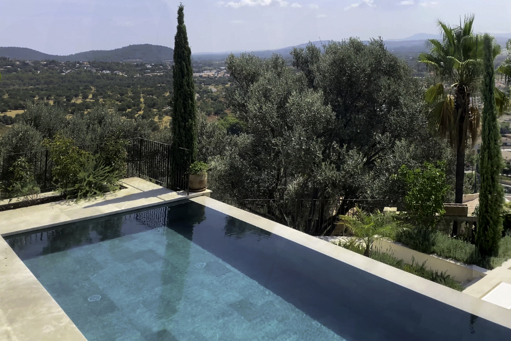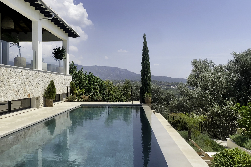 Carefully landscaped, the garden reflects the natural character of the island — structured, native, and alive with quiet detail. Layered with palm and olive trees and mallorquin stonewalls, the design invites a seamless flow between architecture and environment.