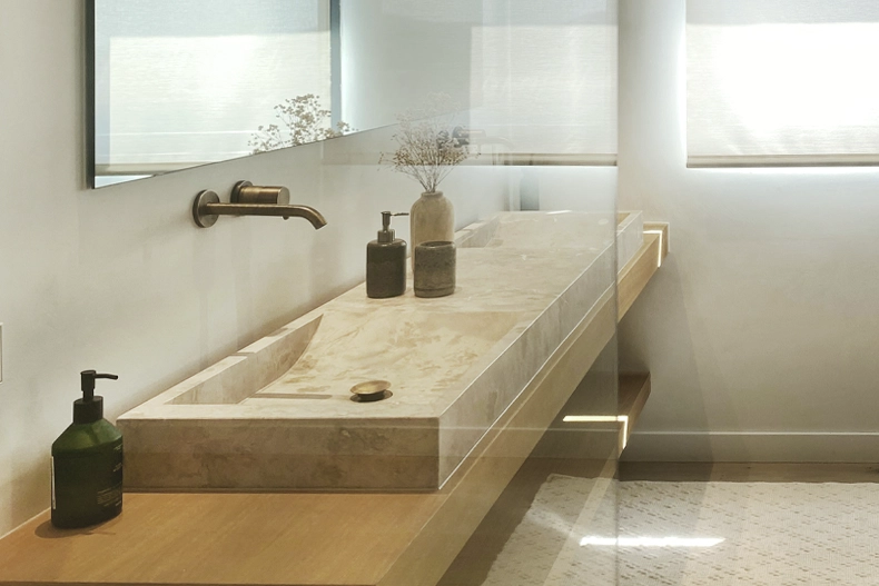 Every surface has been chosen with care. Natural stone, handcrafted wood, brushed metal, and bespoke fittings come together in a palette that feels tactile, timeless, and deeply harmonious.